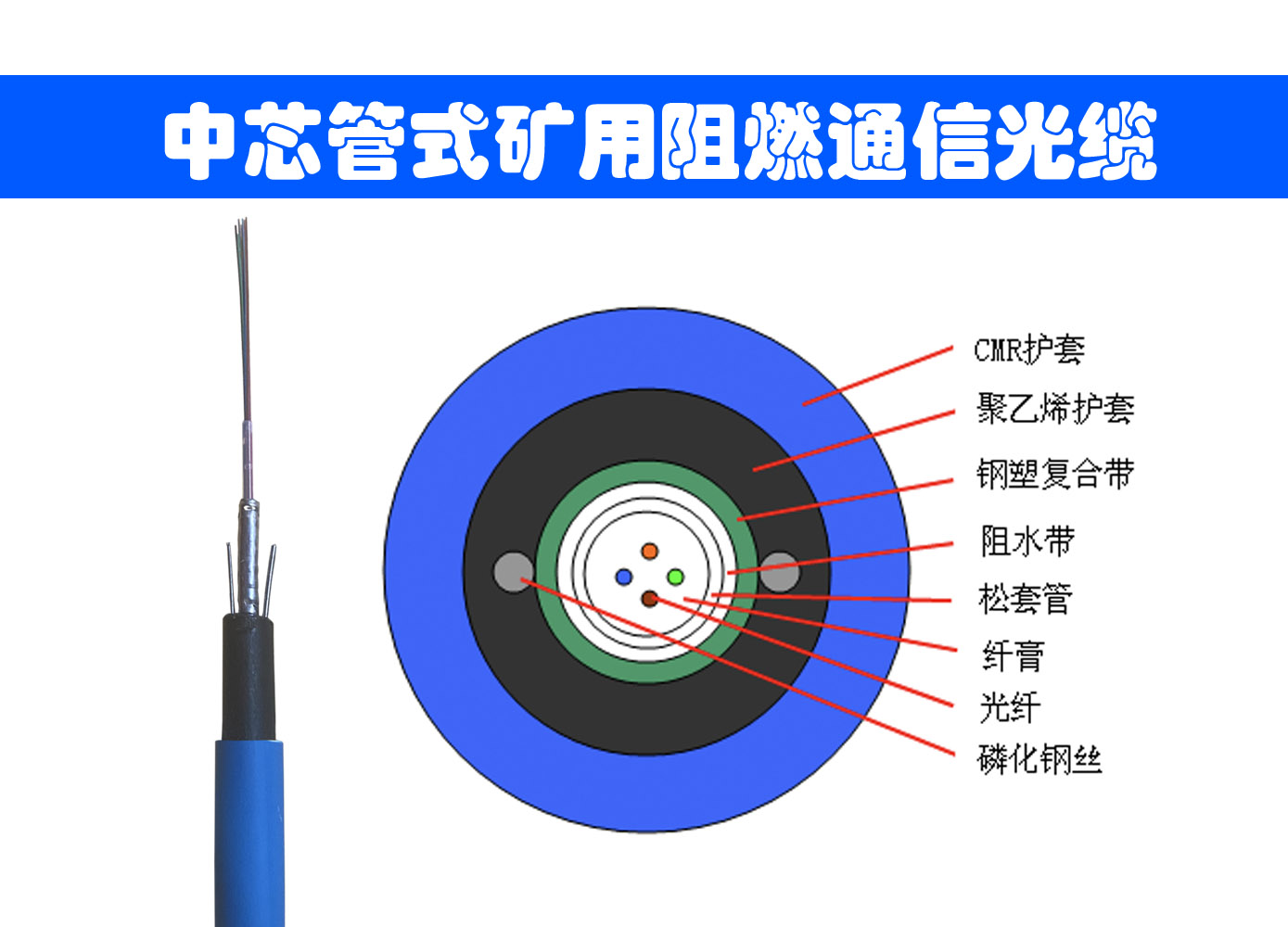 MGXTW型光纜是金屬加強(qiáng)構(gòu)件、中心管填充式、夾帶鋼絲的鋼-聚乙烯粘結(jié)護(hù)套、藍(lán)色聚氯乙烯阻燃護(hù)套通信用室外光纜。束管內(nèi)填充阻水油膏,束管和護(hù)套間填充阻水帶,外包藍(lán)色阻燃CMR