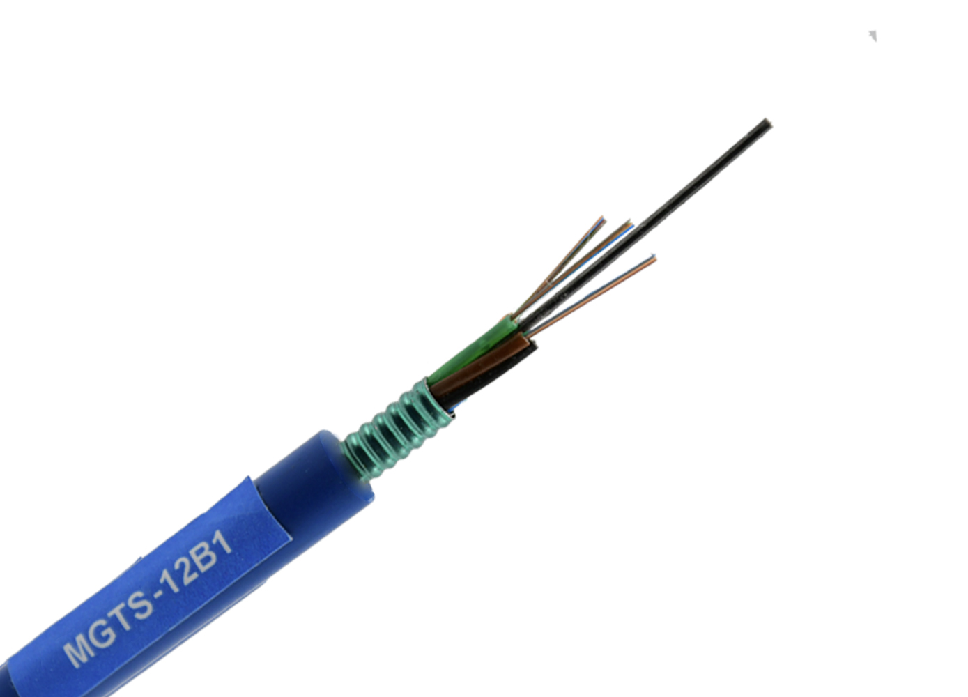 MGTS光纜的結(jié)構(gòu)是將250 m光纖套入高模量材料制成的松套管中,松套管內(nèi)填充防水化合物。纜芯的中心是一根金屬加強芯,對于某些芯數(shù)的光纜來說,金屬加強芯外還需擠上一層聚乙烯(PE)。松套管(和填充)圍繞中心加強芯絞合成緊湊和圓形的纜芯纜芯內(nèi)的縫隙充以阻水填充物。雙面涂塑鋼帶(PSP)縱包后擠制阻燃護套成纜。