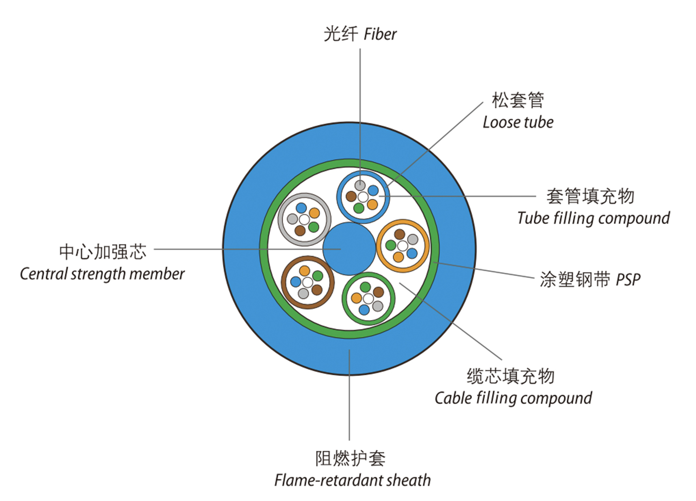 Thefibers,250pm, are positioned in a loose tube made ofa high modulus plastic. The tubes are filled with awater-resistant filling compound. A steel wire, sometimes sheathed with polyethylene (PE) for cable withhigh ber count, locates in the center ofcore as a metallic strength member. Tubes (and llers) are strandedaround the strenath member into a compact and circular cable core. The PSP is longitudinally applied ovethe cable core. which is lled with the lling compound to protect it from water inaress. The cable iscompleted with a ame-retardant sheath.